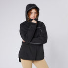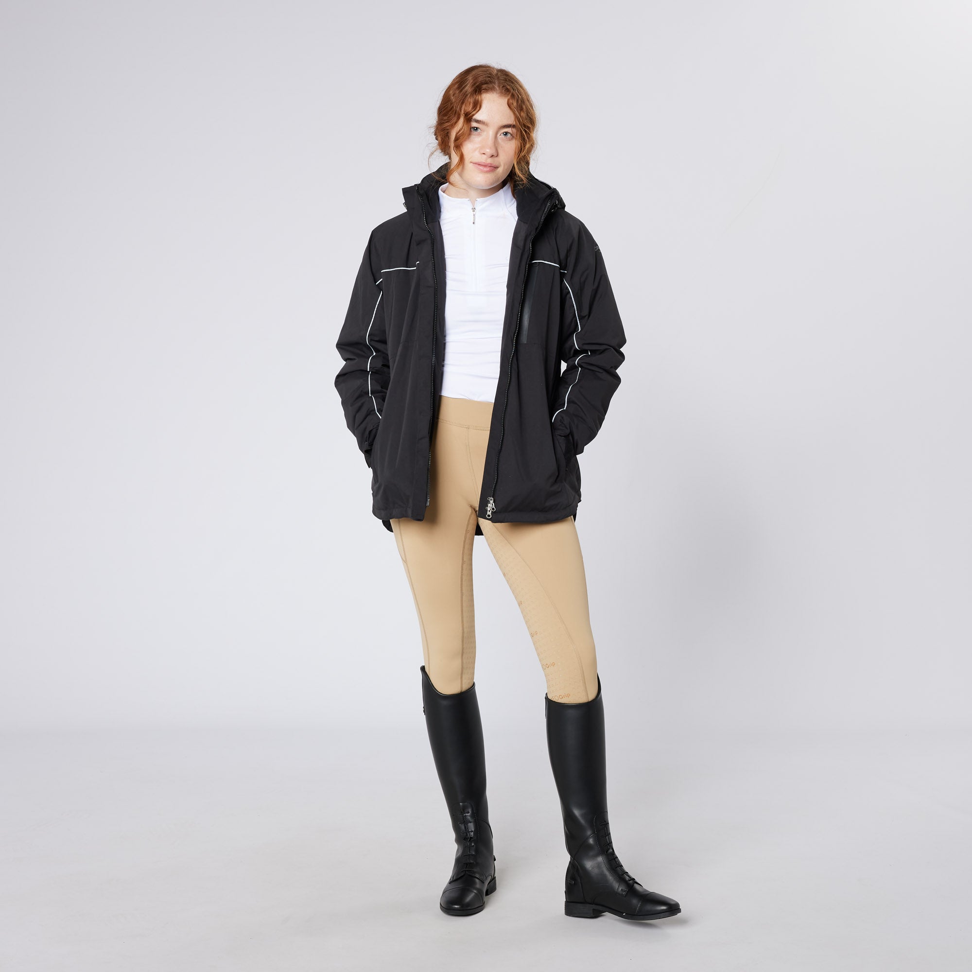 Winter weight thermo riding jacket specifically tailored for comfortable riding. Double rear vents. Fleecy lining for improved warmth. Ergonomic sleeves with adjustable velcro fastening at the cuffs. Functional two-way front zip. Removable, adjustable hood with reinforced peak for additional protection from the elements. Three zipped pockets at the front. Reflective details. Two-way front zip. Wash 40°. Waterproof & breathable to 10000mm.